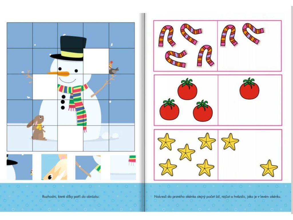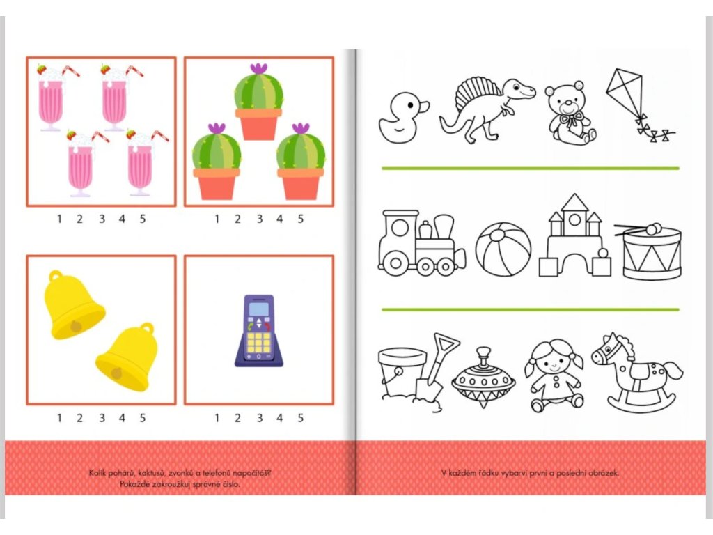Díky pestrému výběru aktivit si vaše dítě rozvíjí základní dovednosti, jako je počítání, vybarvování, kreslení, logické uvažování, jemná motorika a mnoho dalšího. Děti budou počítat obrázky, hledat rozdíly, překreslovat obrázky, hledat cestu bludištěm či obtahovat linie.
