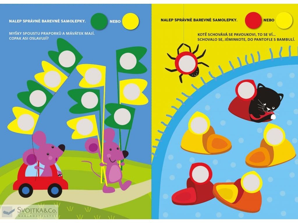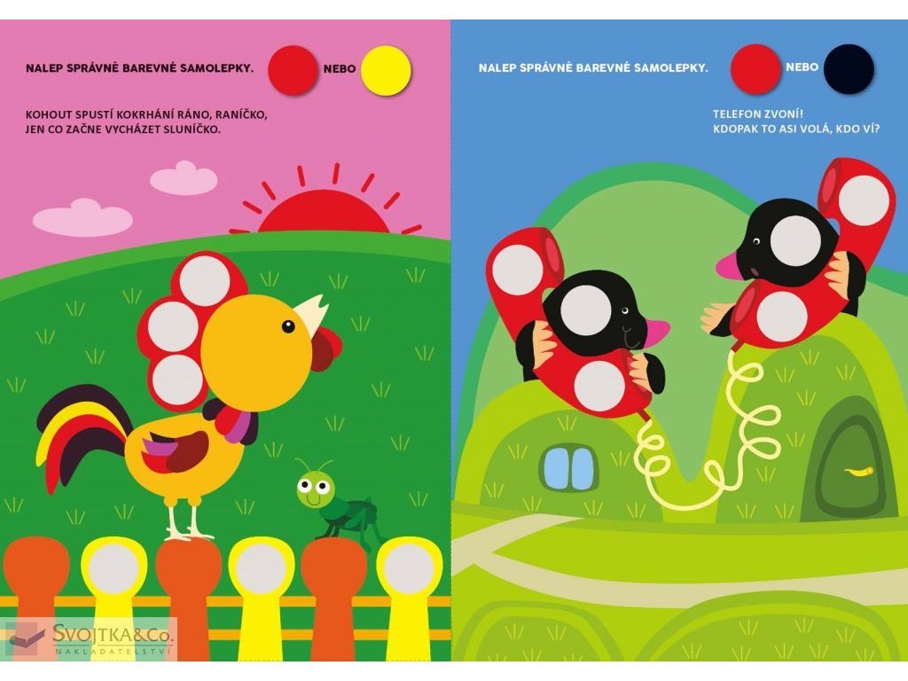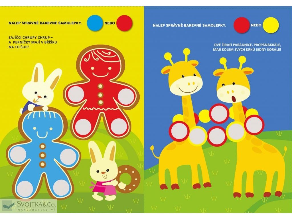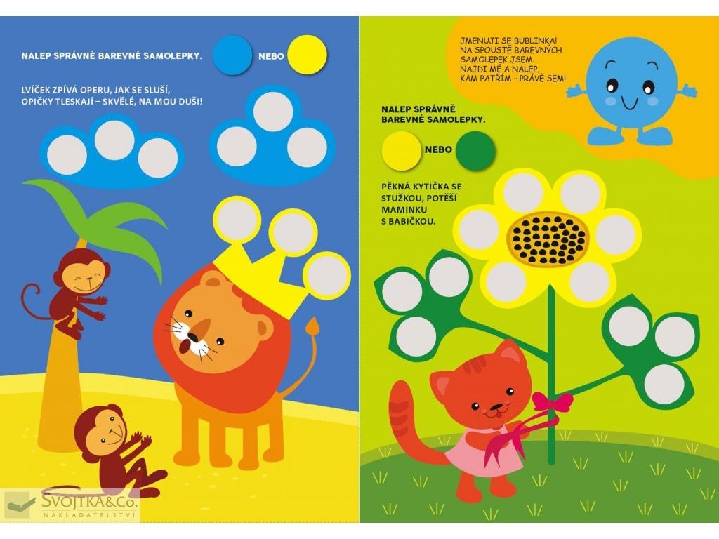 Kohout spustí kokrhání ráno, raníčko, jen co začne vycházet sluníčko. Umíš si vybrat správnou barvu ze dvou a doplnit samolepky do obrázku? Velryba přátelská je přeci, to ví všichni – i mořští šneci. Dokážeš si vybrat ze dvou barev a použít samolepku k dokončení obrázku? V této knížce najdou naši nejmenší plno jednoduchých aktivit a 140 samolepek, které jim pomohou naučit se jednoduše a bez námahy rozeznávat barvy. Kulaté barevné samolepky – "bublinky" – se lehce nalepují, krátké texty s veselými rýmy pomáhají cvičit paměť a snadno se opakují, barevné obrázky v knížce přitahují pozornost a napomáhají soustředění. Tak honem! Najdi tu správnou barvu bublinky a nalep ji tam, kam patří!