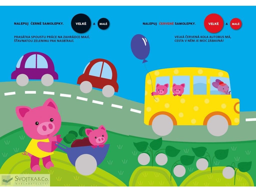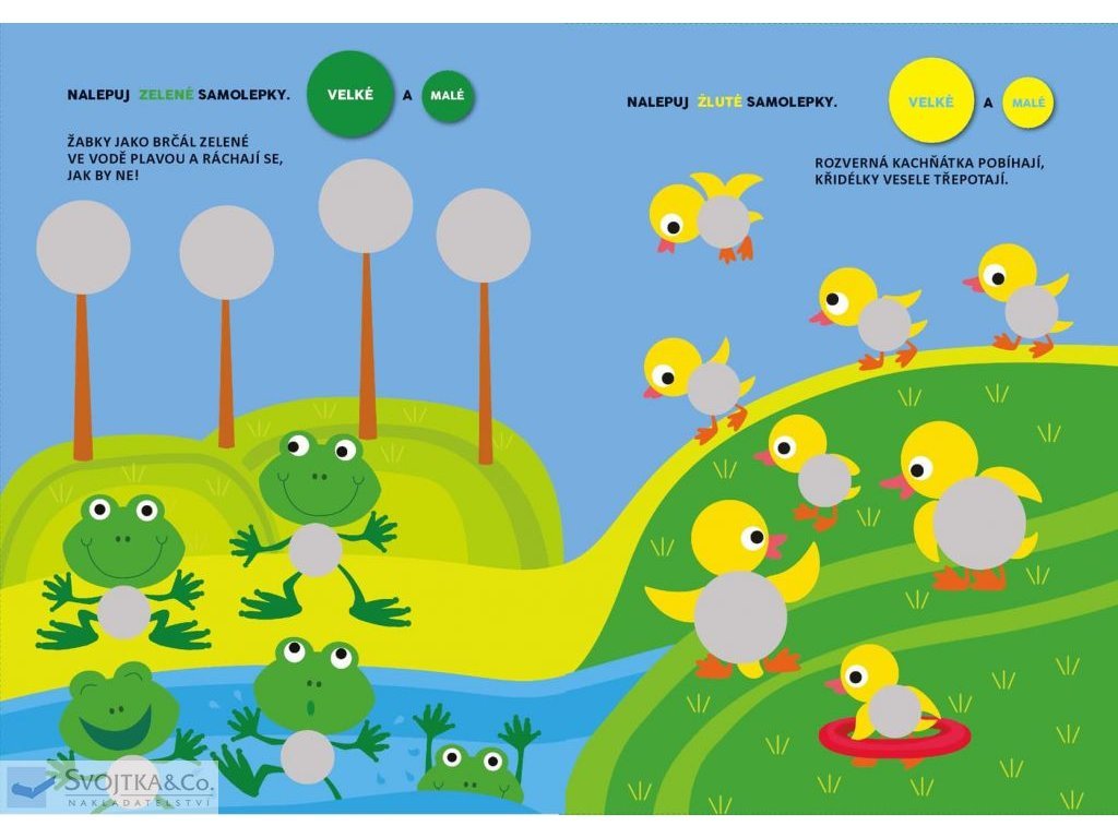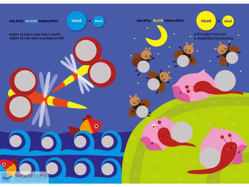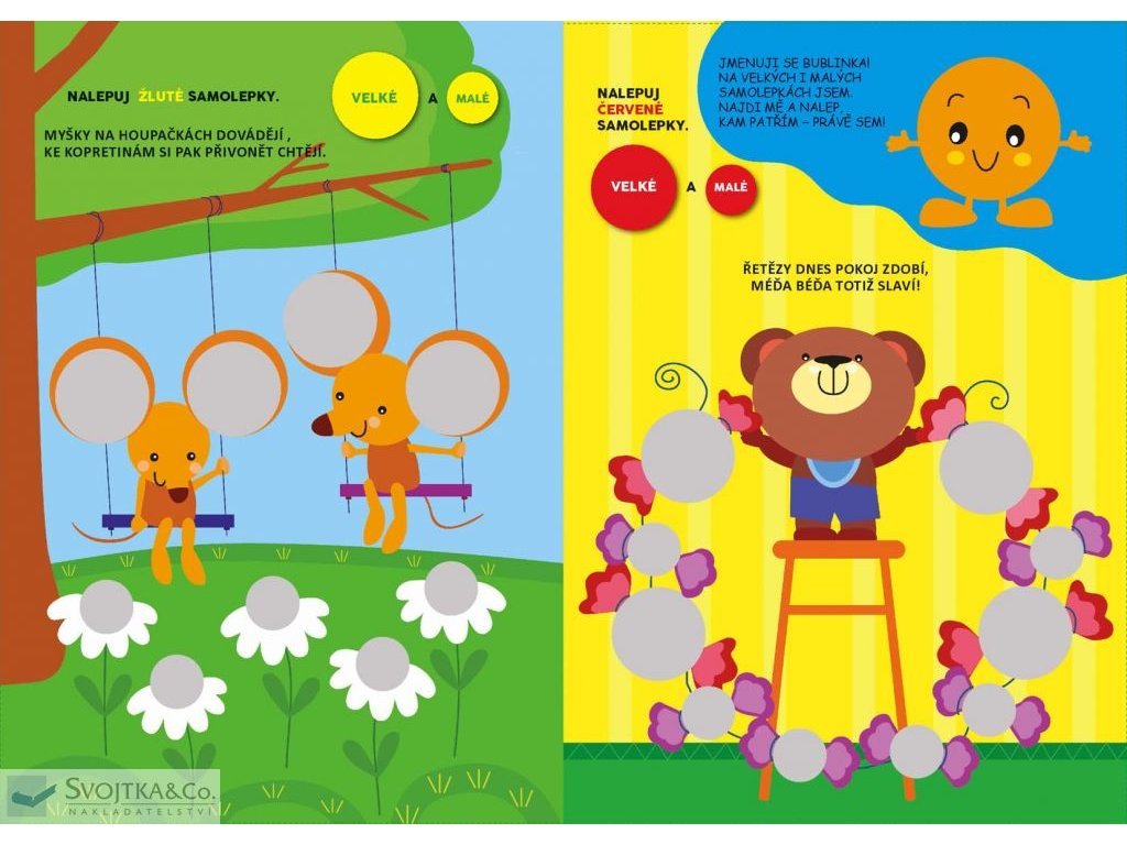 V této knížce najdou naši nejmenší plno jednoduchých aktivit a 120 samolepek, které jim pomohou naučit se jednoduše a bez námahy rozeznávat barvy a velikosti. Kulaté barevné samolepky – "bublinky" – se lehce nalepují, krátké texty s veselými rýmy pomáhají cvičit paměť a snadno se opakují, barevné obrázky v knížce přitahují pozornost a napomáhají soustředění.