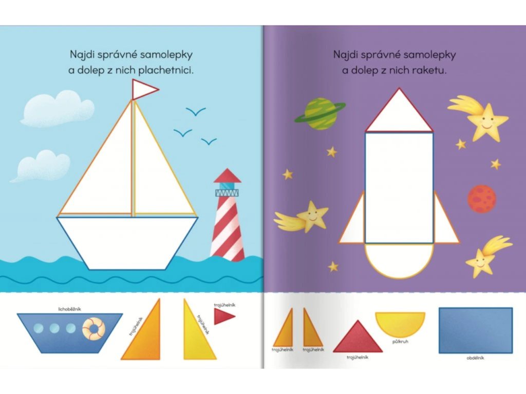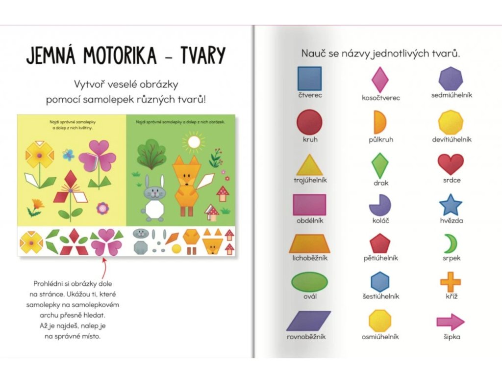 Pracovní sešit se samolepkami pomáhá dětem předškolního věku naučit se dobře poznávat tvary. Aktivity rozvíjí učení tvarů, barev i jemnou motoriku.