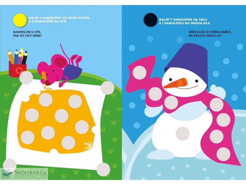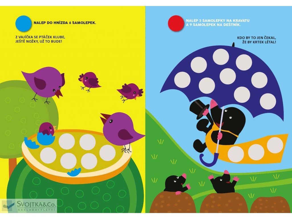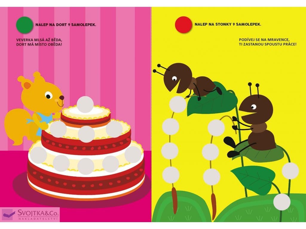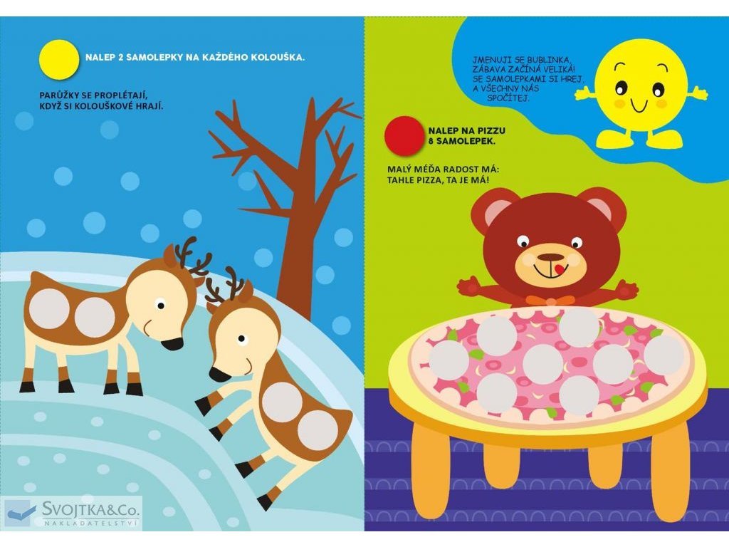 V této knížce najdou naši nejmenší plno jednoduchých aktivit a 140 samolepek, které jim pomohou seznámit se jednoduše a bez námahy se základními číslicemi. Kulaté barevné samolepky – "bublinky" – se lehce nalepují, krátké texty s veselými rýmy pomáhají cvičit paměť a snadno se opakují, barevné obrázky v knížce přitahují pozornost a napomáhají soustředění.