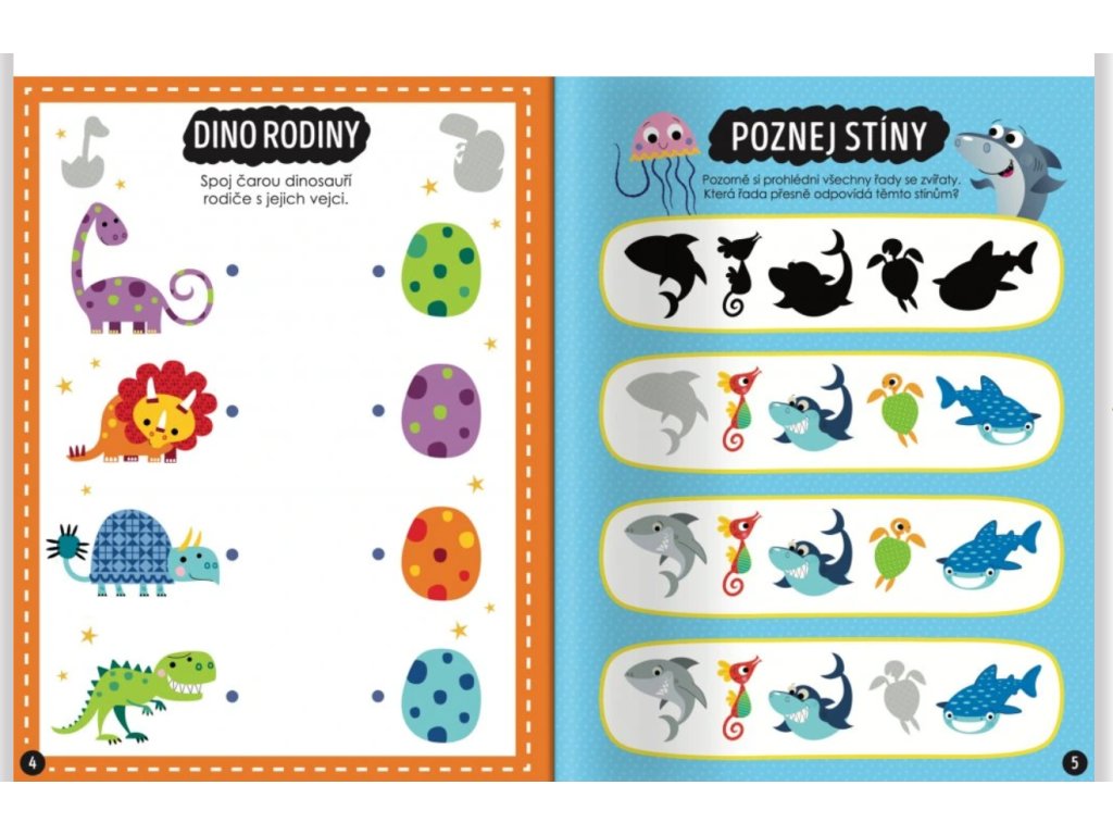 S touto knihou plnou aktivit se děti rozhodně nudit nebudou! Budou přiřazovat stíny zvířátkům, hledat stejné obrázky, pomůžou princeznám s přípravami na ples a ještě spoustu dalšího!